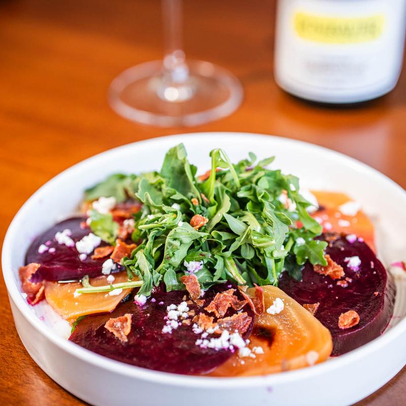 In-house cooked and marinated red and golden beets topped with prosciutto crisp and goat cheese crumbles, drizzled with aged balsamic reduction.