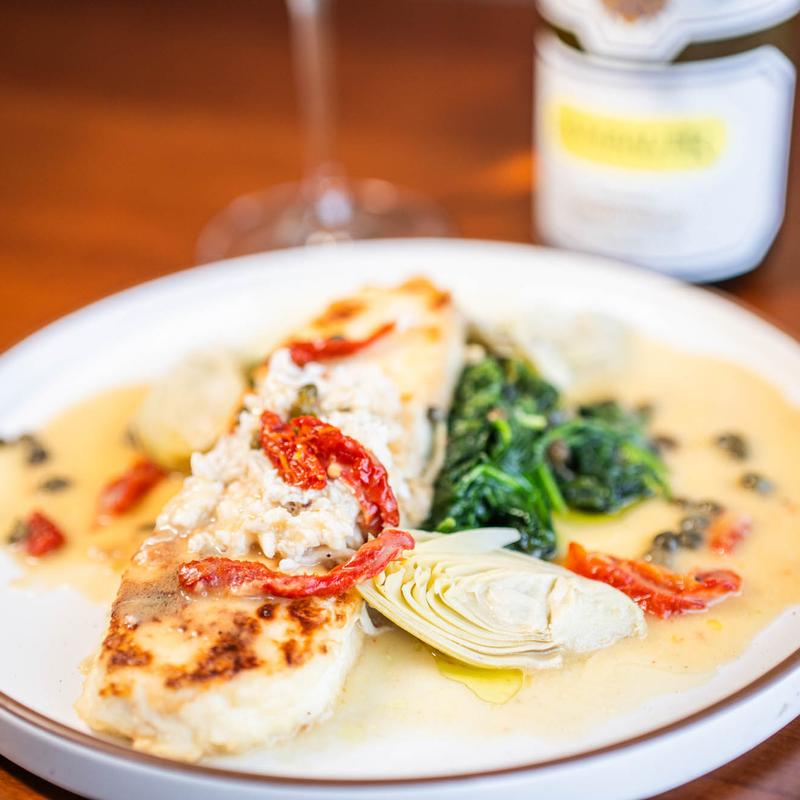 Fresh grouper egg battered, finished in a chardonnay lemon butter sauce, served over sautéed spinach and angel hair.