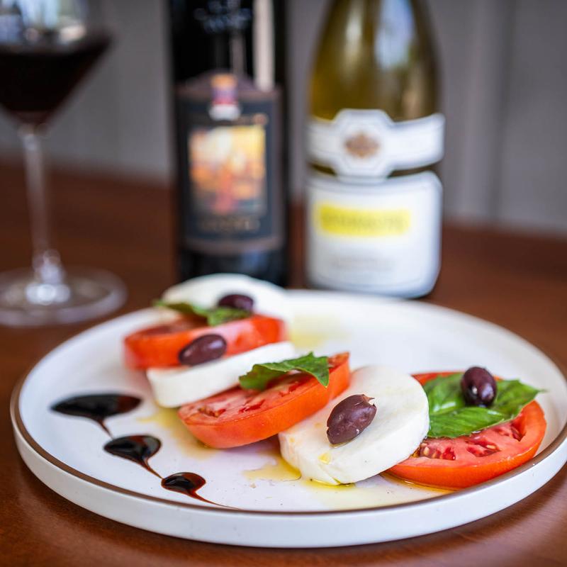 Fresh tomatoes and fresh house-pulled mozzarella topped with basil, extra virgin olive oil, and aged balsamic reduction drizzle.